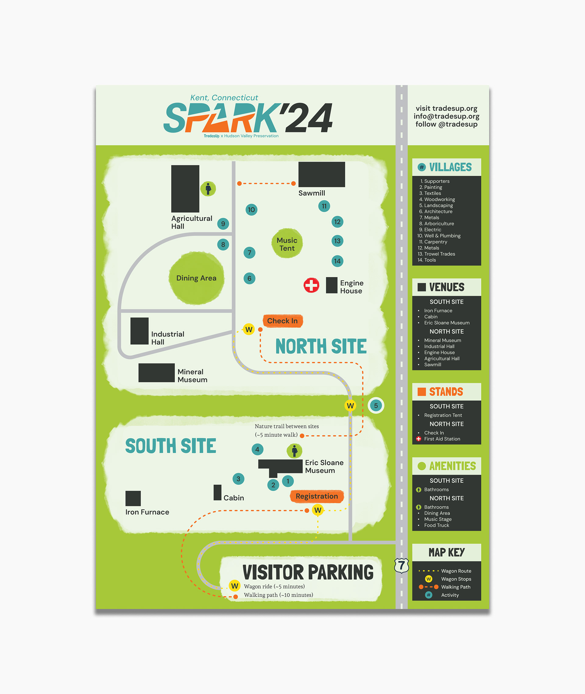 A full rebrand for an expanding non-profit organization bringing the experience of trade-work to the next generation, as well as a subbrand, map, and wayfinding signage for their yearly event.