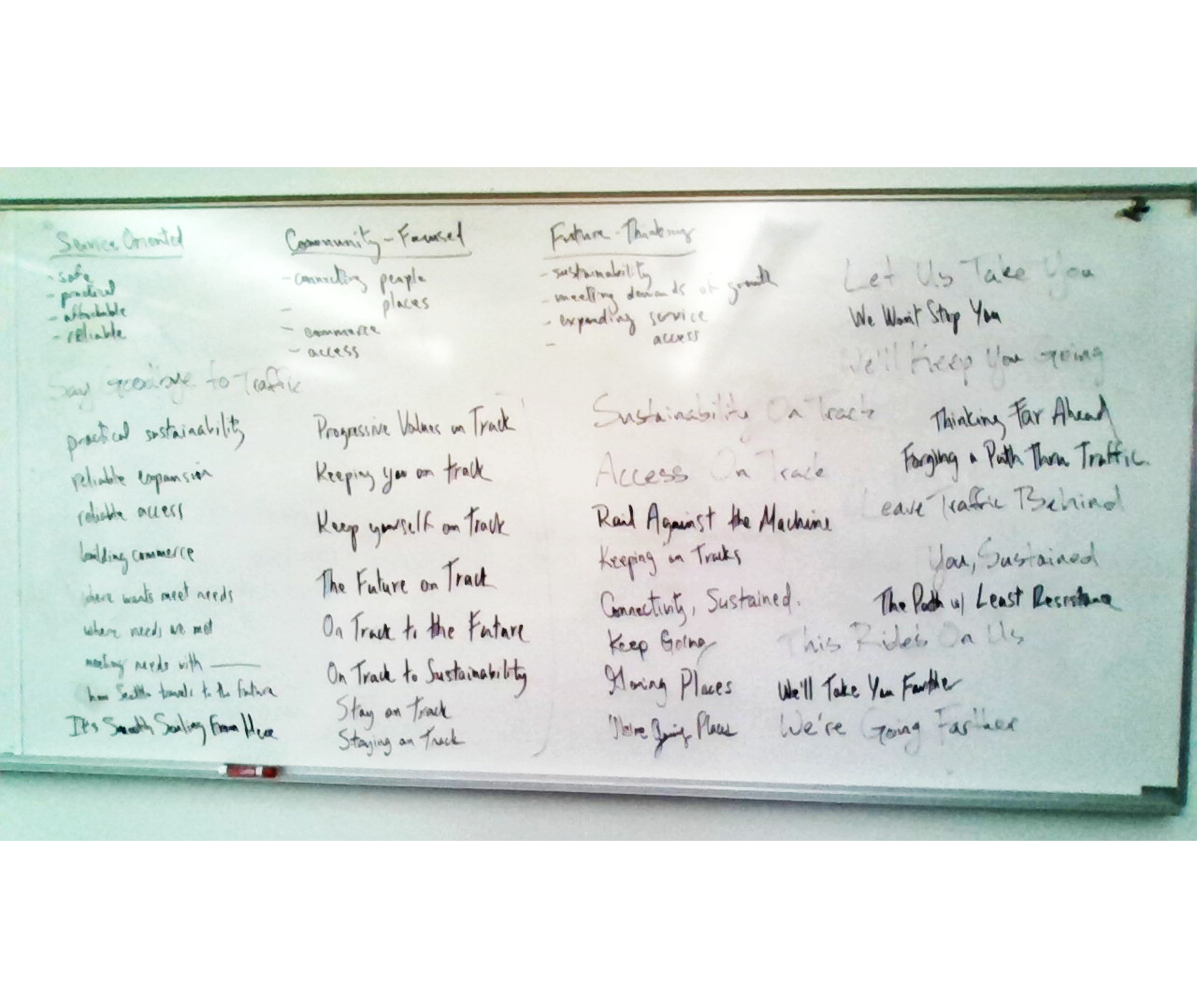 We explored the different word associations lists and brainstormed related ideas on a white board to develop our slogan, eventually finding the versatile, themed, and succinct “on track.”