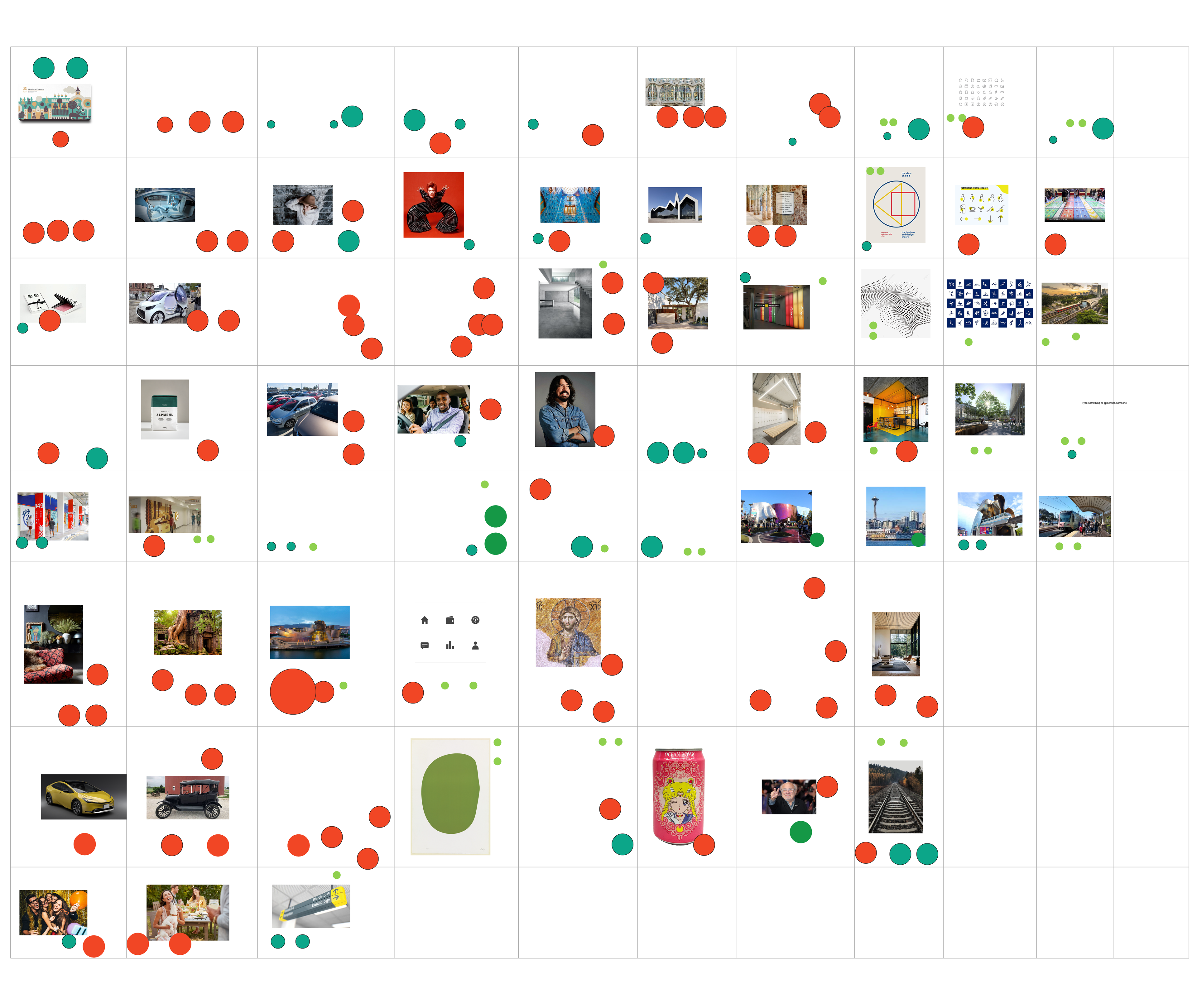 The clusters of green dots gave us a visual representation of the images most widely associated with our sentiments.