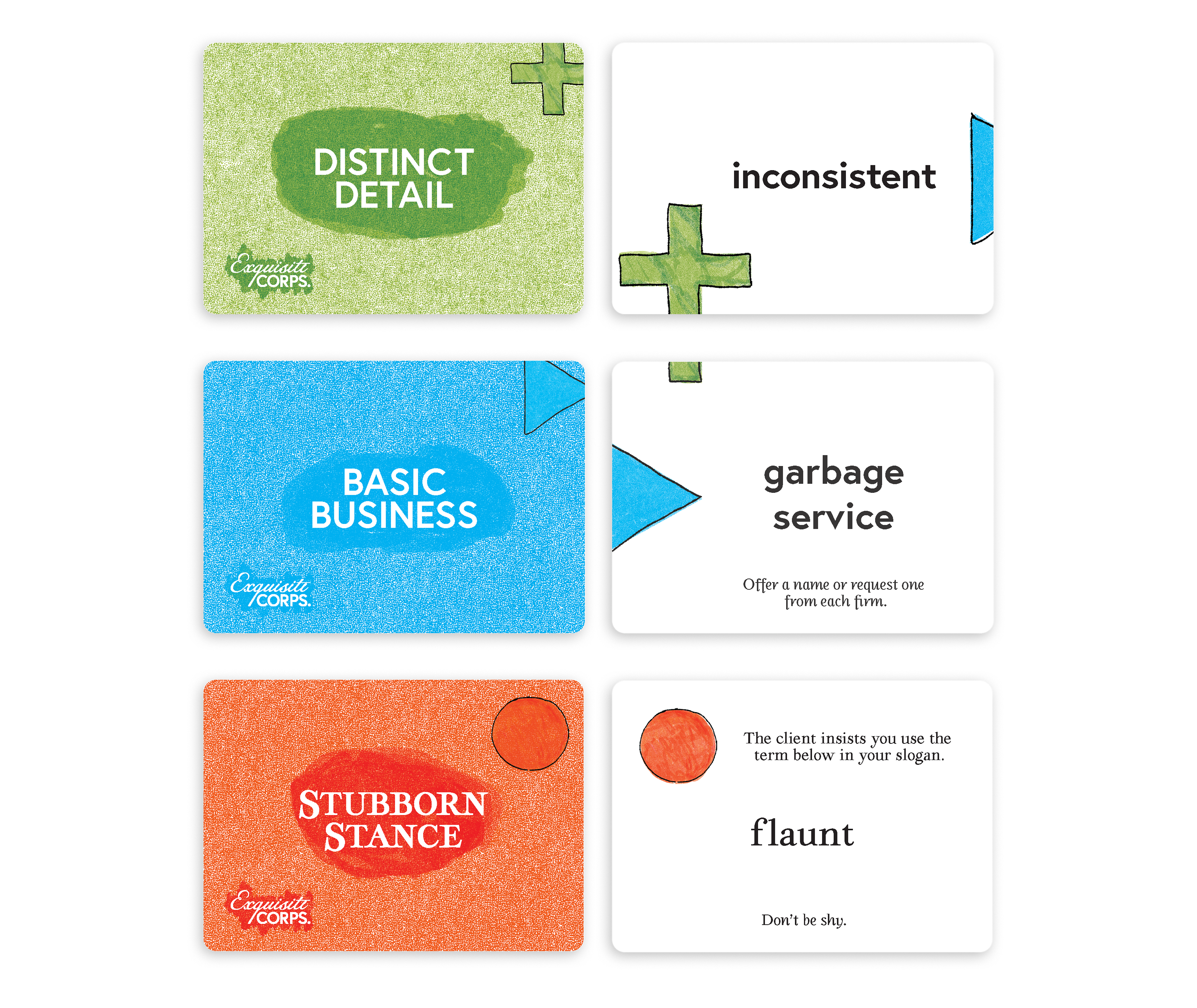 The name was changed to give the game a greater sense of impromptu whimsy. Inspired by the parlor game, exquisite corpse, where people blindly contribute parts to create a monster, ExquisiteCORPS. creates the same absurd creature in business form for players to create fun names and slogans.