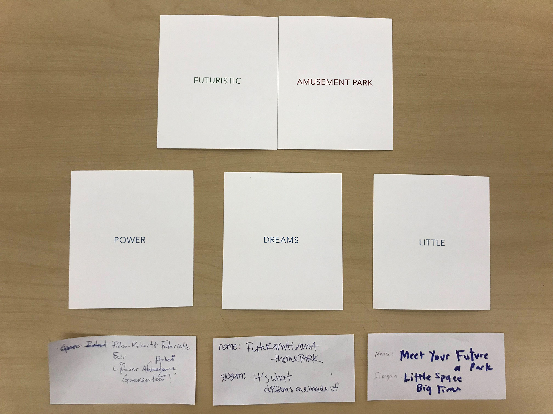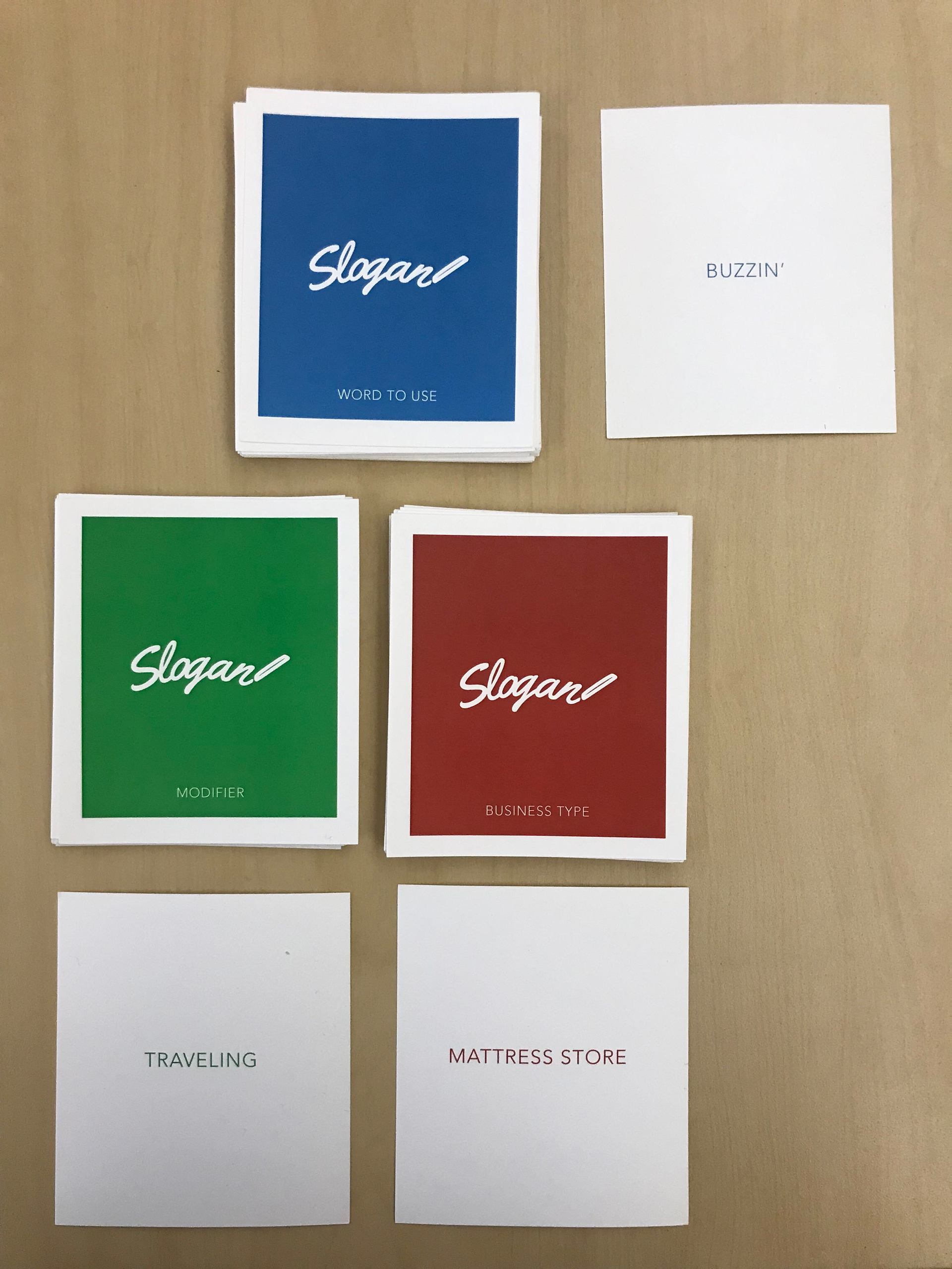 The game was originally conceived of and populated by myself and my friend, Everett, around 2016. It's original name was Slogan! and one copy of a basic prototype was printed out in order to play amongst ourselves.