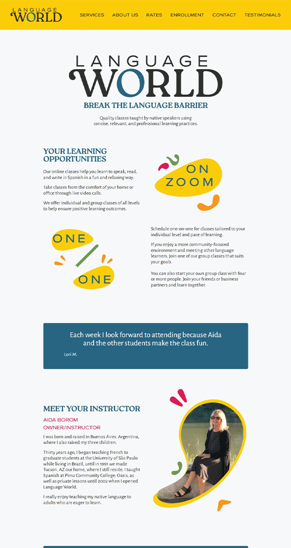 The school had been long established, with a vast number of reviews from previous and current students online which were scoured to find the attributes that best conveyed learning at Language World.