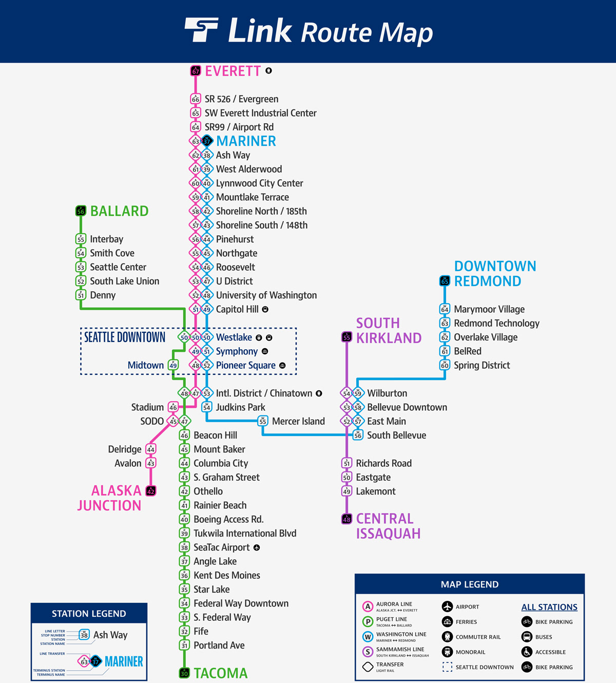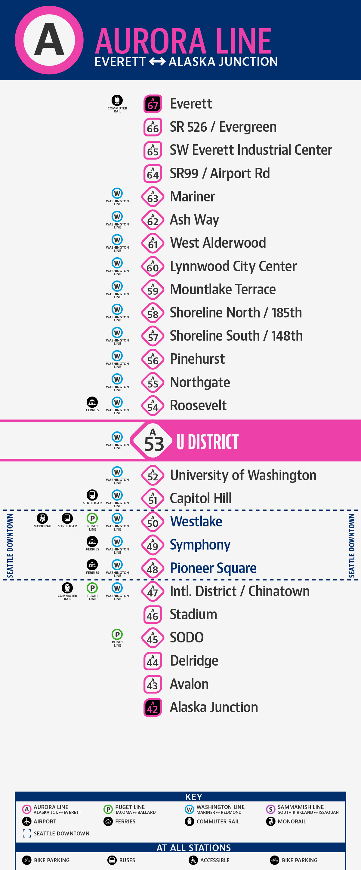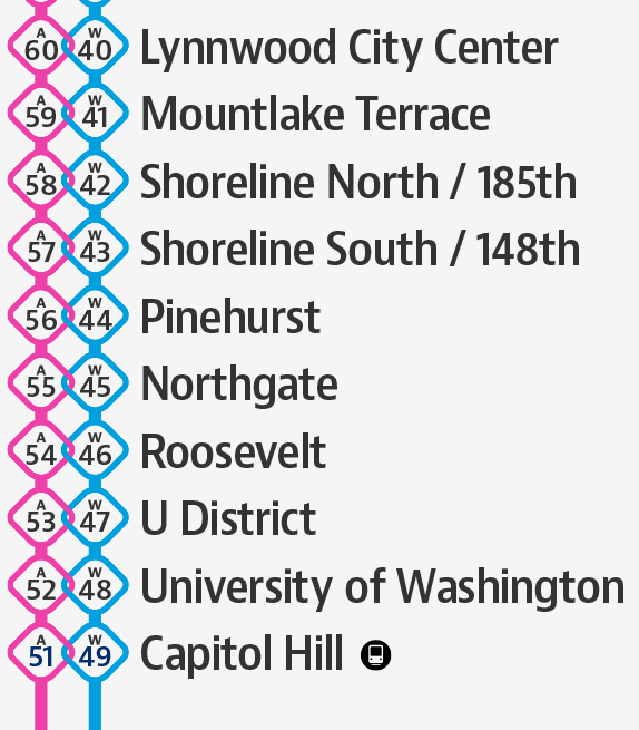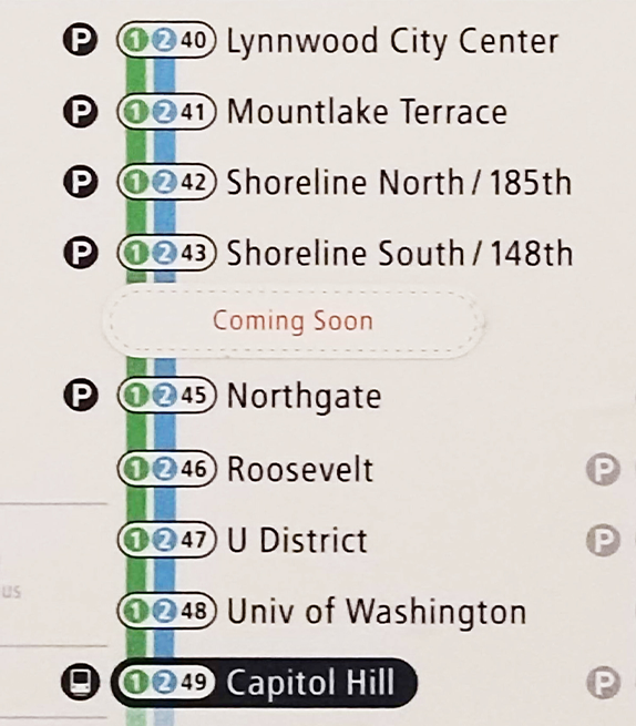 Section of full service map highlighting Seattle downtown stations and inversion of station numbers from Capitol Hill upward.
