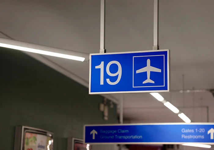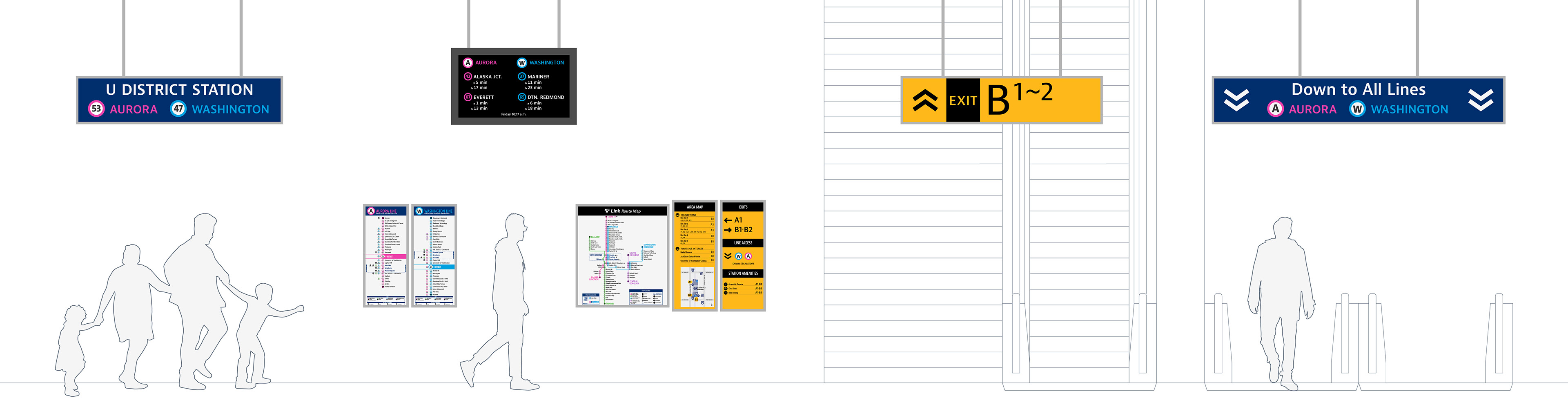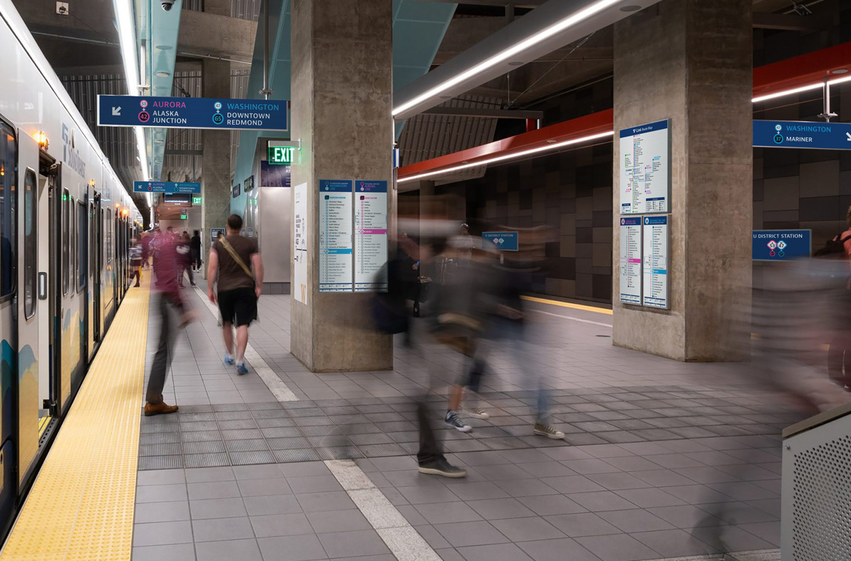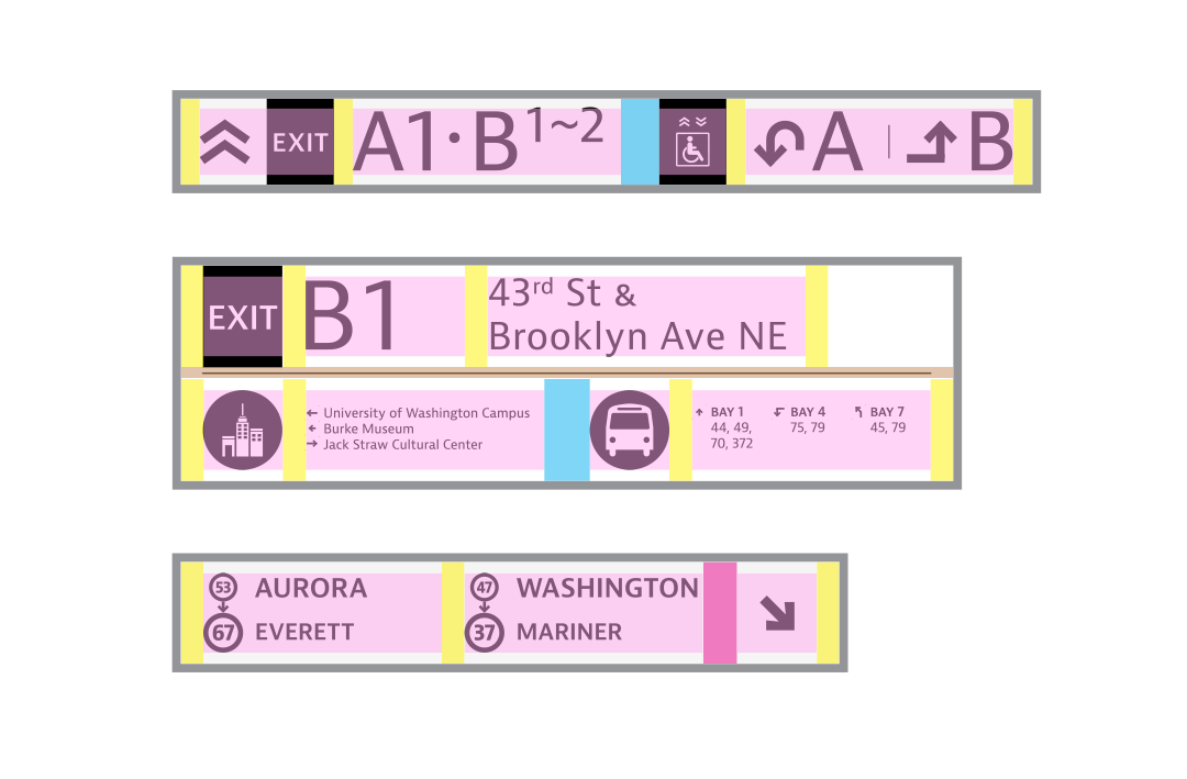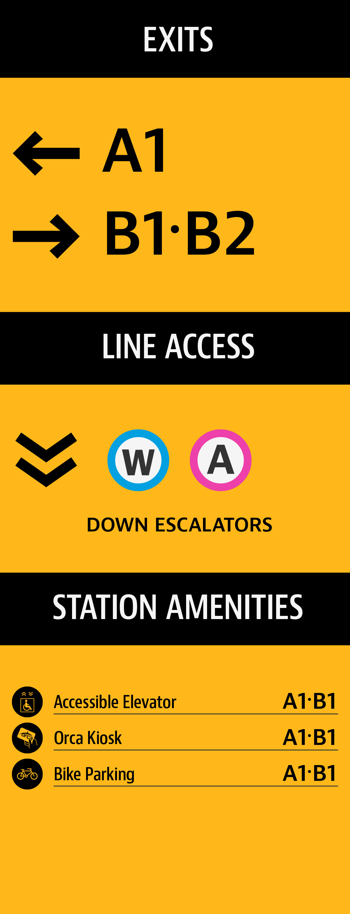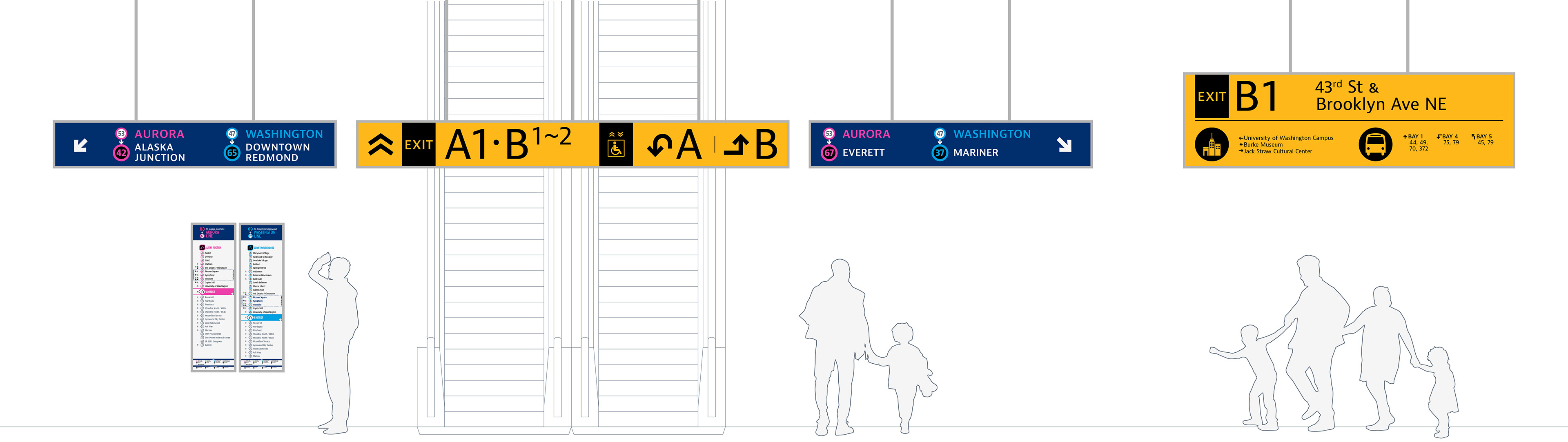 Orientation panels listing points of interest and bus connections by categories to make finding correct exits easier.